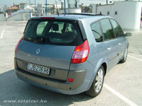 Hátulra szerencsére csak játszásiból ültem: nagy fejem pont elérte a tetőkárpitot, pedig 180 centinél alacsonyabb vagyok. Gyerekek persze igaziból is elférnek. A különbség valahol ott kezdődik, ahol az ötüléses változat tengelytávja véget ér. A két felfüggesztés között 5 centiméterrel, a hátsó tengely után pedig további 18 centivel nyújtották meg az autót, az így nyert majd' negyed méter pedig szépen elsimította a korábban púpos tetővonalat, és könnyed vonalvezetésű, halandó szemmel könnyebben befogadható látványt varázsolt a Scenicből.