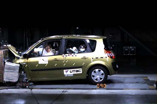 A frontális ütközést egy pont veszteséggel teljesítette a Scenic. Ebben nem kis része volt az intelligens légzsákoknak, melyek azon kívül, hogy az ütközés nagyságától függően nyílnak, szenzorok segítségével figyelembe veszik az elős üléseken helyet foglalók testsúlyát és alkatát is. Okos megoldás, hogy a biztonsági öv két pántjára külön-külön előfeszítőt szereltek , így az ütközés energiája kíméletesebben oszlik el az utasok testén. Nagyon odafigyeltek a lábtér biztonságos kialakítására, a sofőr lábsérülési esélyeit légzsák nélkül igyekeztek minimálisra szorítani.
